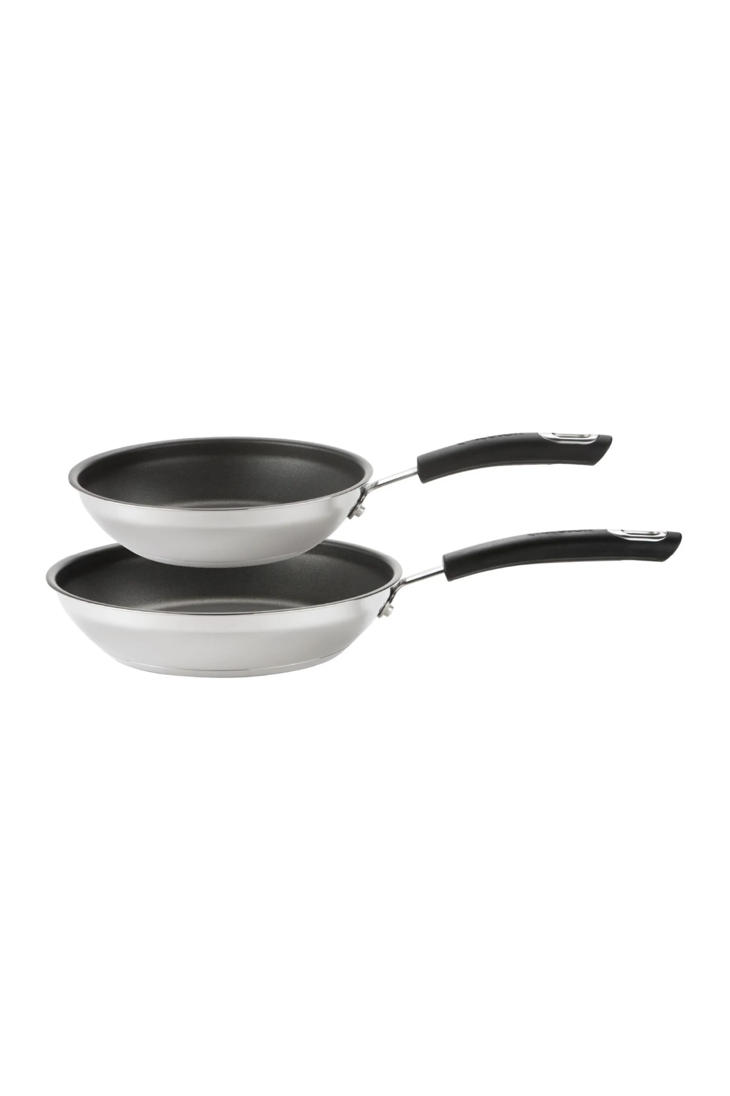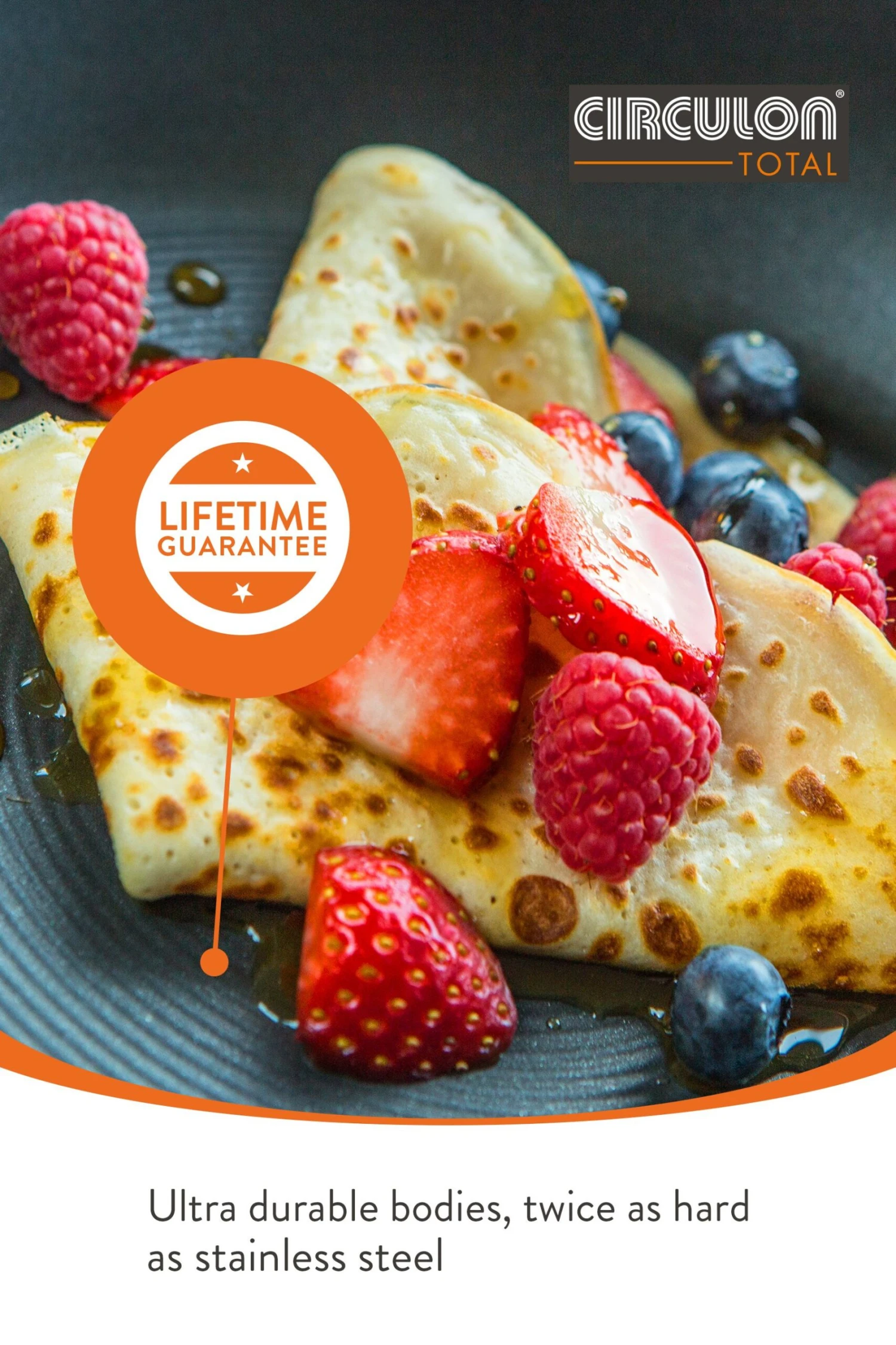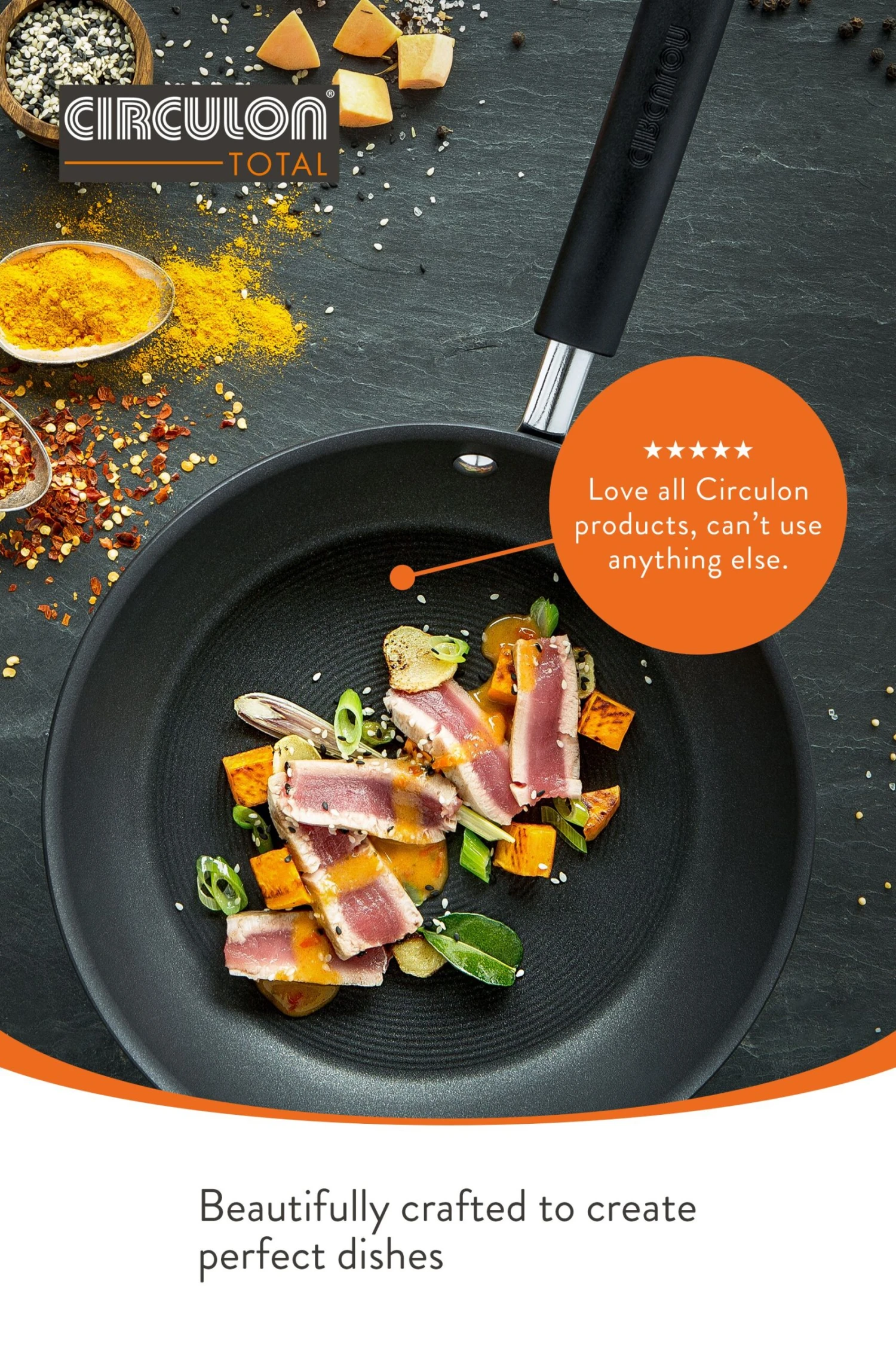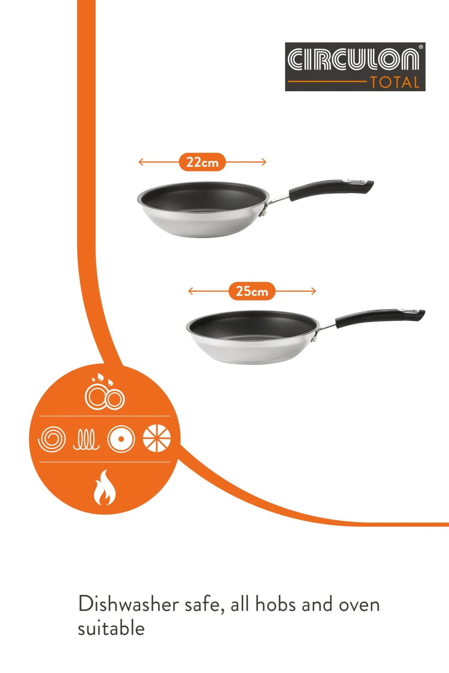 Exceptional cooking for life with the Circulon Total Stainless Steel twinpack frying pan set (22&25cm) This pan is the next generation of non-stick, featuring a specially formulated 3-layer, circular technology system for exceptional food release. No oil necessary. Our innovative non-stick formula is long-lasting. Crafted from heavy-gauge stainless steel, it is exceptionally durable cookware. It features an extra-thick steel base which heats quickly with no hot spots. Suitable for all hobs including induction and oven-safe up to 180°C/350°F/gas mark 4. The handles have been tested and re-tested for durability and safety. Three-layer non-stick system: The Ultra Total non-stick system lasts longer and prevents sticking in the pan. The Hi-Low system with grooves ensures special abrasion resistance, allowing you to cook healthy food with little to no oil. For all hob types including induction: This practical pan is suitable for all types of stoves – whether gas, induction, halogen or electric. The forged super-induction base prevents the creation of hot spots. Robust material: The highly durable stainless steel from which the pan is made ensures that the heat is distributed quickly and evenly. The pans glass lid keeps heat in while allowing you to keep an eye on your food. Oven-safe up to 260°C: With the heat-resistant, robust handle, the pan can be easily placed in the oven – it is oven-safe up to 180°C, and totally dishwasher-safe.