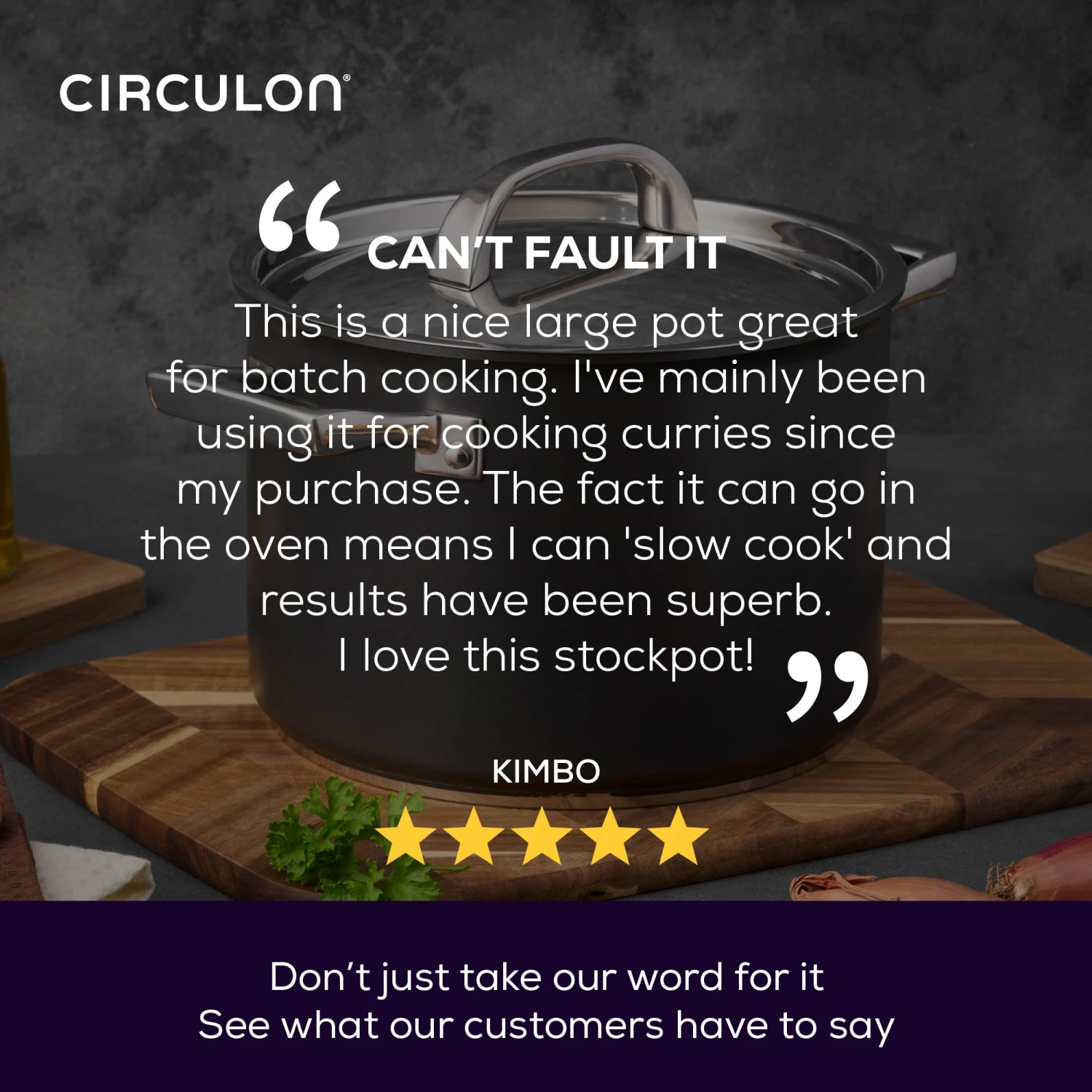 Showcasing the Circulon signature Hard Anodized finish, with an encapsulated stainless steel and aluminium base, this Stockpot is twice as tough as traditional stainless steel cookware, making it a robust pot that combines innovative technology with hob to oven capability.