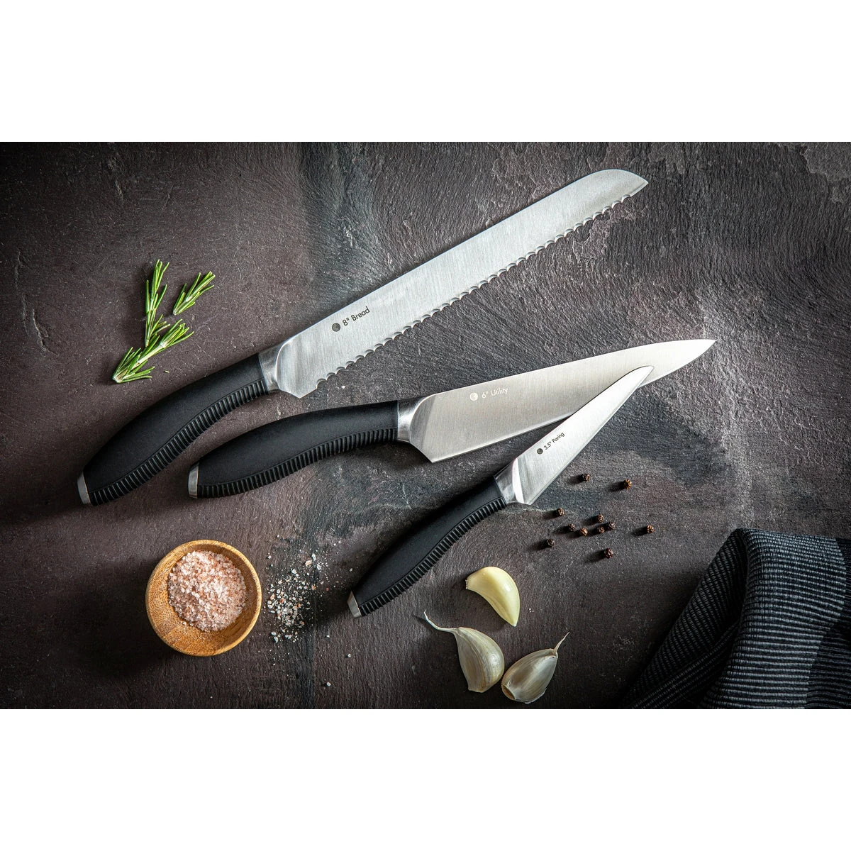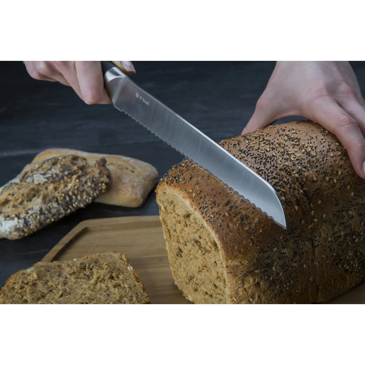 8″ Bread knife -with razor-sharp serrated edge cuts through fresh breads without crushing them out of shape. Also perfect for slicing cakes with soft, fluffy textures.