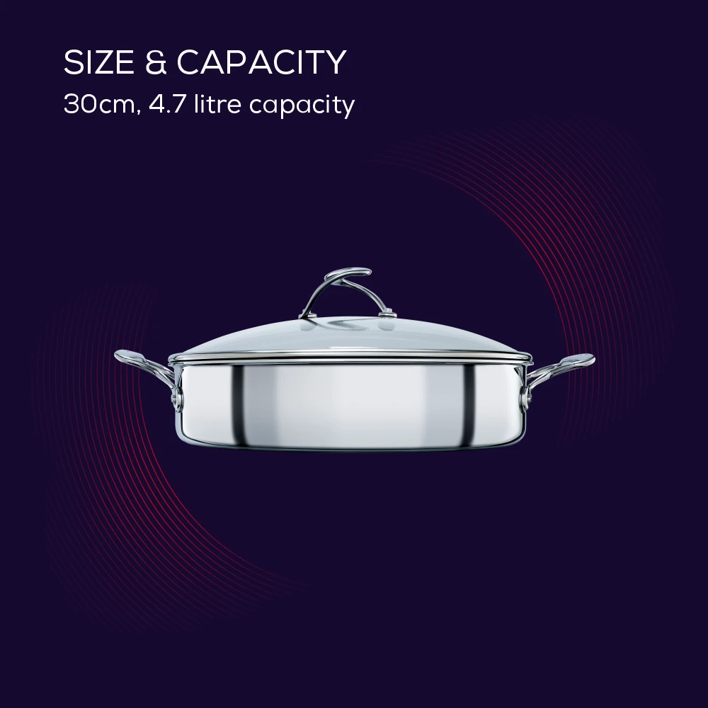 If you’re looking for a premium stainless steel 30cm sauteuse covered pan then you need to discover the Circulon SteelShield Induction Hybrid Non-Stick Sauteuse Pan & Lid with a 30cm diameter.