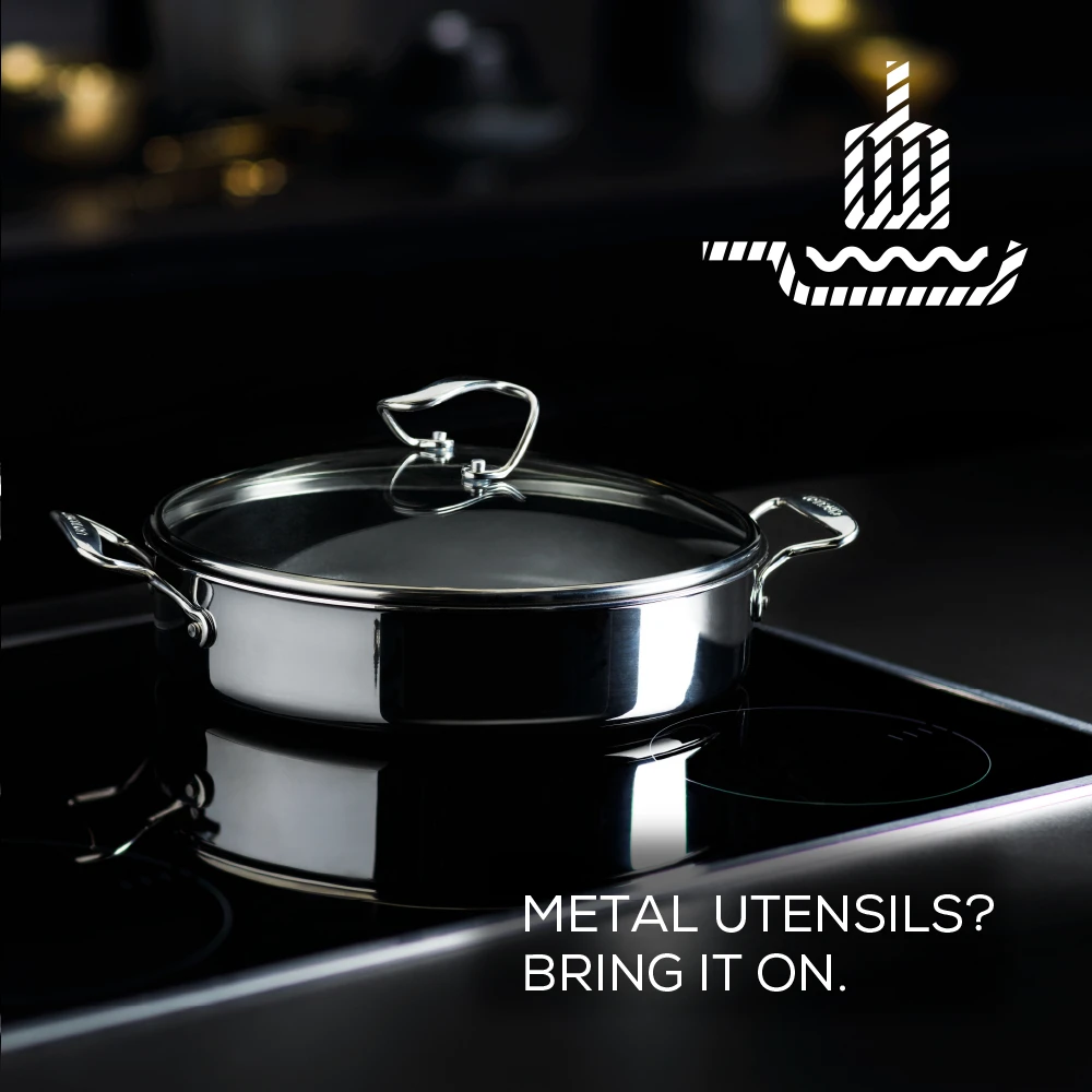 - SUITABLE FOR ALL STOVETOPS – The clad construction is especially optimised for induction hobs.